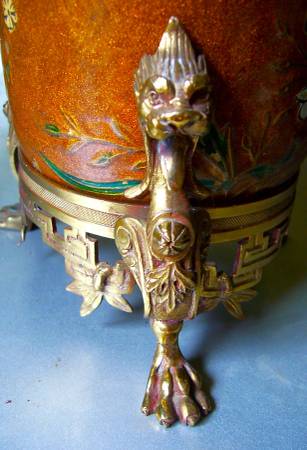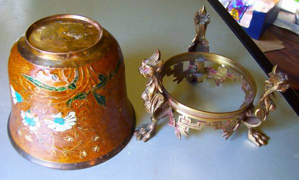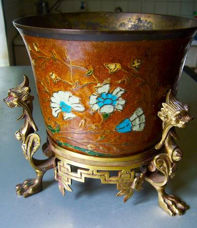 A copper alloy of heavy metal, this fondue sits perched on its golden base protected by three dragons. Pot measures 5" high and 6 1/4" high on its base. Top diameter is 6" Dragons stand 4 1/2" high....