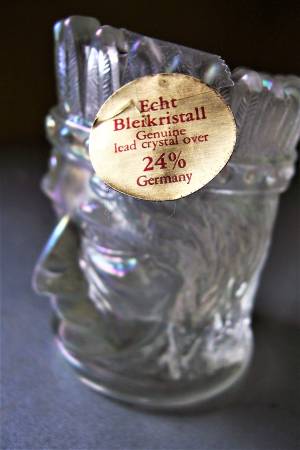 1. Antique St. CLAIR lead crystal Indian head toothpick holder. Measures 2 3/4" high and has 1 7/8" diameter. $12.