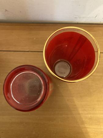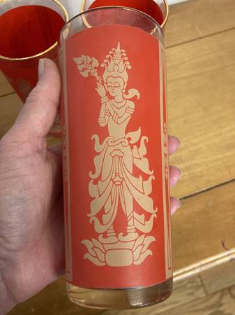 Mid Century Drinking Glass. Set of 4. Red and Gold Thai Goddess Highball Glass. Some gold worn on top of 2 glasses. I live close to south county mall in Oakville. I prefer text or call please,...