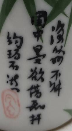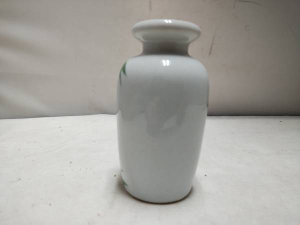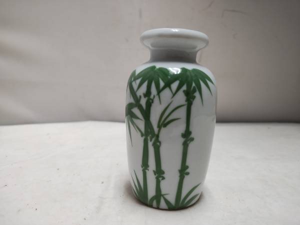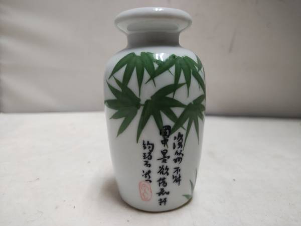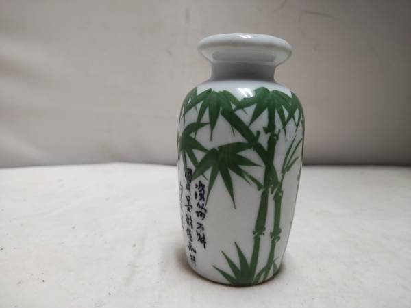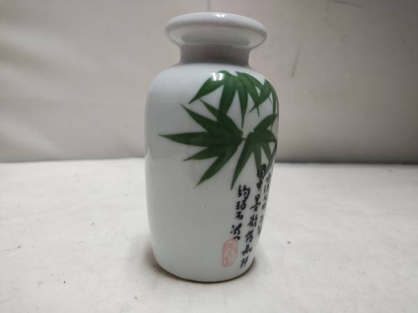 A small white glazed porcelain ceramic vase, with bamboo (green), Chinese characters (black), and author seal (red). Bamboo and bamboo-patterned items are considered lucky or fortuitous gifts, with connotations of flexibility and achievement as well.