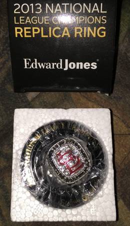 This is a ST. LOUIS CARDINALS 2013 NATIONALLEAGUE CHAMPIONS REPLICA RING that was given out on April 12, 2014. I am the original/only owner. The ring isnicely detailed. The face of the ring is the familiar STL logo surrounded onthe four sides by the words: National League Champions Cardinals. One side ofthe ring displays the word Cardinals below which is a replica jersey with thebirds on bat. The other side has the year, 2013, and the championship trophybelow it. The ring and box are in excellent condition. The ring wasremoved from the box for these photos.