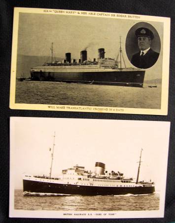 1. British Railways S.S. "Duke of York". 2. "QUEEN MARY". Insert photo, Captain Sir Edgar Britten. $4 each or both for $7. Meet to exchange or include $2 to mail.