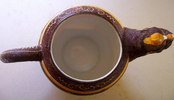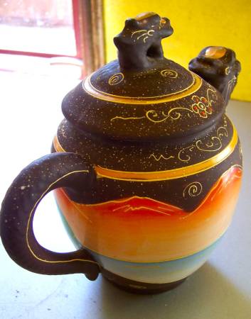 1. Dragon teapot measures 6" high by 6 3/4" wide and has a barrel diameter 3 1/2". $50.