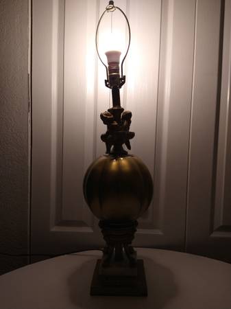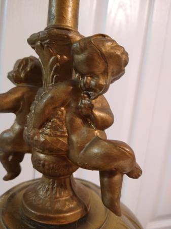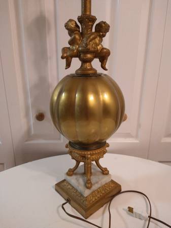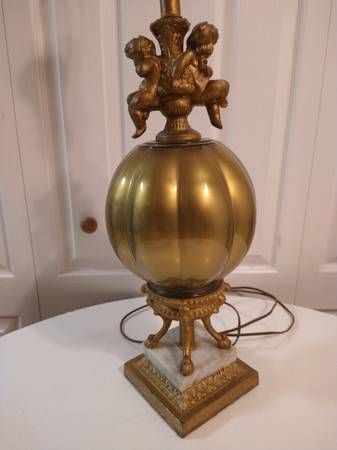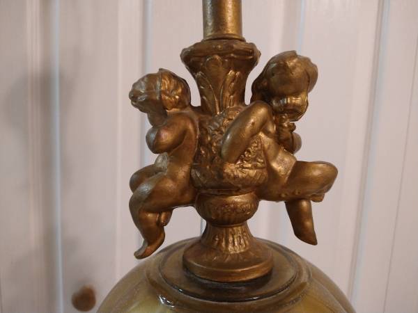 Vintage Hollywood Regency Style Brass Cherub Marble Fluted Glass Table Lamp