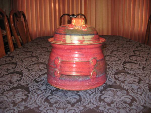 Signed Zappa Colorado Pottery stoneware soup tureen/casserole dish, cut out in lid for the handle for your ladle to protrude, 6" deep base, 8 1/2 inches tall to top of lid, $10.00. Beautiful colors!...
