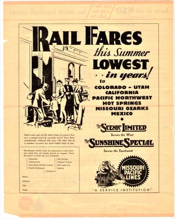 American National League KSD Missouri Pacific Lines Railroad Rail Fares Advertisement