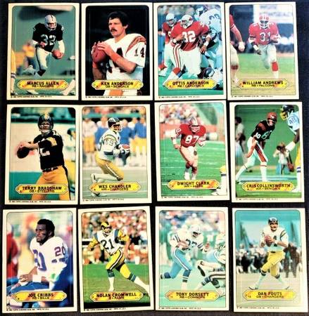 Here for sale is a 1983 Topps Football Sticker Insert Set (NM+ Condition - Very Nice/Clean/Sharp!). A great Vintage Football set that includes a Marcus Allen RC a very early Joe Montana Lawrence Taylor Walter Payton Terry Bradshaw Ottis OJ Anderson Dan Fouts Franco Harris Billy Sims+.