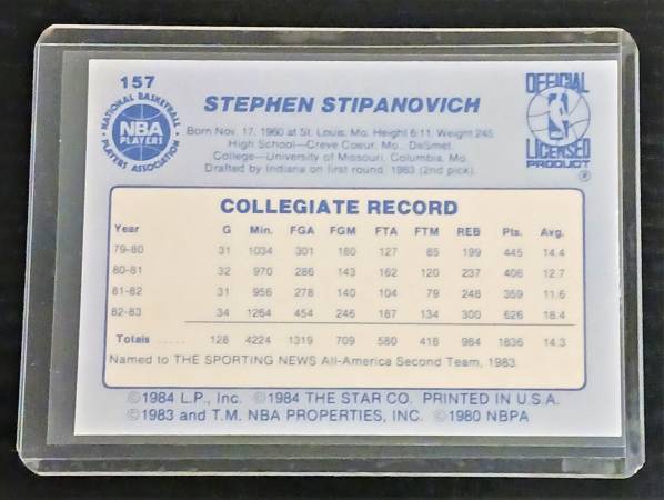 Here for sale is a 1984 Star Basketball Card #157 Steve Stipanovich Rookie card. This card has nice centering and looks sharp. Don't miss out on this great vintage card.