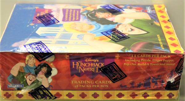 Here for sale is a 1996 Disney's The Hunchback of Notre Dame Unopened box (48 packs each) of trading cards (includes: puzzle, finger puppet, pop-out cards & more) . The boxes look very good/clean/as-new.