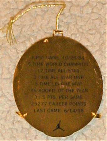 Here for sale is a 1999 Michael Jordan Gold Christmas Ornament. This is unused and looks as new. It was made after he retired from the NBA the second time and it has some of his major accomplishments printed on the back. Michael Jordan items are in huge demand. Don't miss out on this great item.