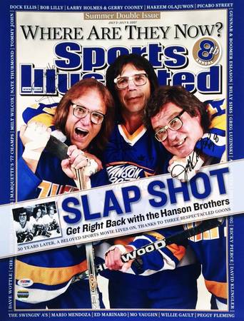 Here for sale is a PROFESSIONALLY AUTHENTICATED BY PSA Signed picture of "The Hanson Brothers" from the All-Time Classic movie Slap Shot (Dave Hanson with Jeff and Steve Carlson) - A Blowup of the Iconic Sports Illustrated 30 Year Anniversary Issue. A great collectible not just for a hockey fan but really for ANY sports fan! This item is 16 x 20 and is ready to be displayed n any Sports Bar, Mancave, Sports Den, Room or Restaurant.