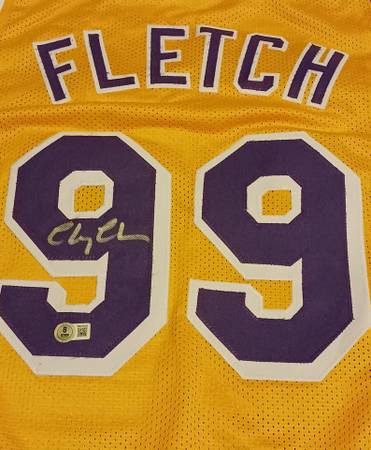 Here for sale is an AUTOGRAPHED Chevy Chase Lakers #99 Jersey - from the Movie Fletch. This is a great fun and very cool signed jersey that is ready to be a highlight in your Man-Cave, Sports Bar, Movie room. This autograph has been authenticated by Beckett!