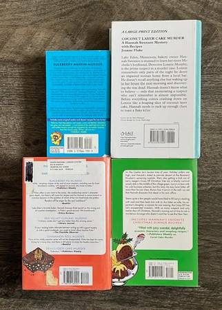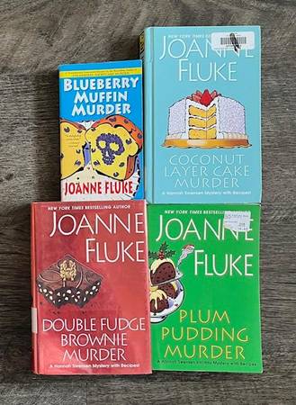 This offer is for a Collection of 4 Hannah Swensen Mystery Series Books (with recipes) by Joanne Fluke. Two of these books are hardcover books, one of the books is an oversized paperback and the other is a smaller paperback book. One of the hardcover books is also a Large Print Book. All of the books are in good to "like new" condition from a smoke free/pet free home. I am offering this book collection as a Lot of 4 Books for only $7! But if wanting to purchase only book from this lot, the price would be $5 for that one book.