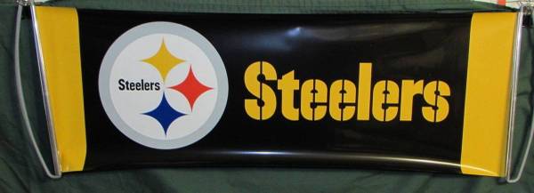 Here for sale is a Pittsburgh Steelers Roll up Banner. It measures about 10x25 inches. There are suction cups on each side so it can stick to just about any surface like a car or house window. It is double sided. One side has the team logo, the other side says touchdown.