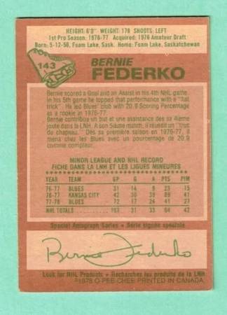 Hello, here for sale is a 1978-79 OPC Hockey card #143 Bernie Federko St. Louis Blues - NHL. This is a HOF (Hall of Fame) Rookie Card!!! Bernie will always be a St. Louis Fan Favorite. The card looks very clean and displays nicely. A Cool Fun Collectible item to show-off in your Sports Room/Bar/Den.