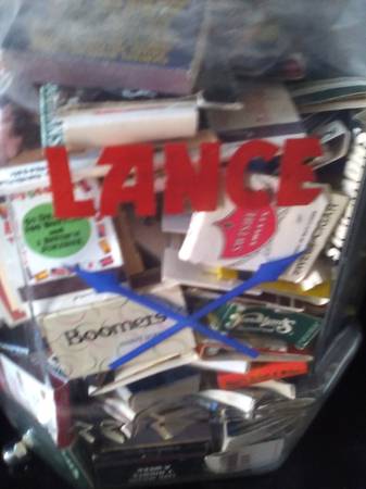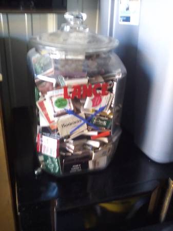 Collectors check this out. I have for sale a glass LANCE snacks jar like they use to have on the counters at stores back from the 1970's PLUS it is filled to the top with old matchbooks from restaurants, bars, strip clubs, etc. Most of the places are old St Louis establishments that are out of business, some still are in business, BUT NOBODY GIVES YOU MATCHBOOKS ANYMORE . This is a great one of a kind item that will bring back many memories.