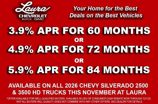 NO HOOKS, NO GIMMICKS, DO NOT LET OTHER DEALERS TELL YOU OTHERWISE! You could qualify for even more incentives, please call dealer for details. 10-Speed Automatic, 4WD, Jet Black w/Cloth Seat Trim, 10-Way Power Driver Seat Adjuster w/Lumbar, 120-Volt Bed Mounted Power Outlet, 120-Volt Interior Power Outlet, 170 Amp Alternator, 2-Speed Electronic Shift Transfer Case, 3.5" Diagonal Monochromatic Display DIC, Auto-Dimming Inside Rear-View Mirror, Bed View Camera, Black Chevytec Spray-On Bedliner, Black Mirror Caps, Black Tailgate Lettering (LPO), Bluetooth® For Phone, Chevrolet Connected Access Capable, Color-Keyed Carpeting Floor Covering, Compass, Custom Blackout Package, Custom Convenience Package, Custom Value Package, CX Safety Package, Deep-Tinted Glass, Dual Rear USB Ports (Charge Only), Electric Rear-Window Defogger, Electronic Cruise Control w/Set & Resume Speed, EZ Lift Power Lock & Release Tailgate, Front Rubberized Vinyl Floor Mats, Gooseneck/5th Wheel Prep Package, HD Rear Vision Camera, Heated & Auto-Dimming Vertical Trailering Mirrors, Heated Vertical Trailering Mirrors, Hill Descent Control, Lane Change Alert w/Side Blind Zone Alert, LED Cargo Area Lighting, LED Smoked Amber Roof Marker Lamps, Locking Tailgate, Manual Tailgate Function w/No EZ Lift, Manual Tilt-Wheel Steering Column, Off-Road Suspension, OnStar Services Capable, Power Door Locks, Power Front Windows w/Driver Express Up/Down, Power Front Windows w/Passenger Express Down, Power Rear Windows w/Express Down, Preferred Equipment Group 1CX, Push Button Start, Rear 60/40 Folding Bench Seat (Folds Up), Rear Cross Traffic Alert, Rear Rubberized Vinyl Floor Mats, Remote Keyless Entry, Remote Vehicle Starter System, SiriusXM w/360L Trial Subscription, Standard Tailgate, Ultrasonic Front & Rear Park Assist, Unauthorized Entry Theft-Deterrent System, Wheels: 20" High Gloss Black Painted, Wi-Fi Hotspot Capable, Wireless Phone Projection, Z71 Off-Road Package. You pay the price listed plus a $604 admin fee, applicable tax, title and license less any extra incentives if available and/or applicable. Please call 573-677-1305 for more details! Laura Auto Group, serving our communities for over 44 years. Please call dealer to verify vehicle availability. Price good through 12/1/25