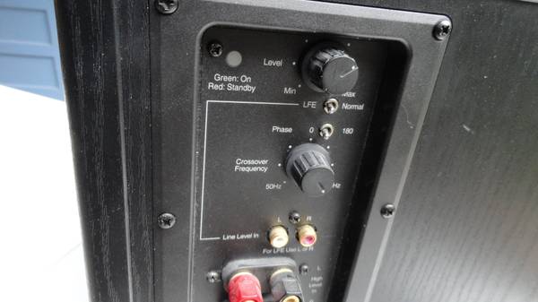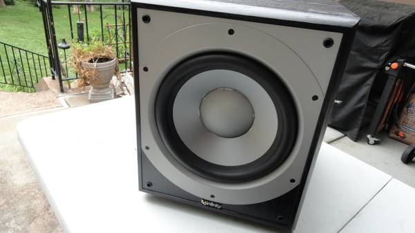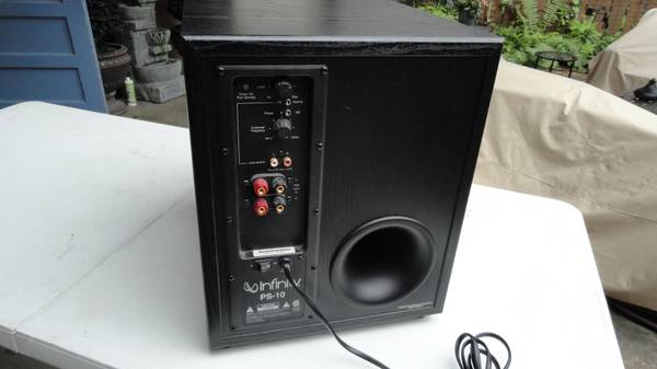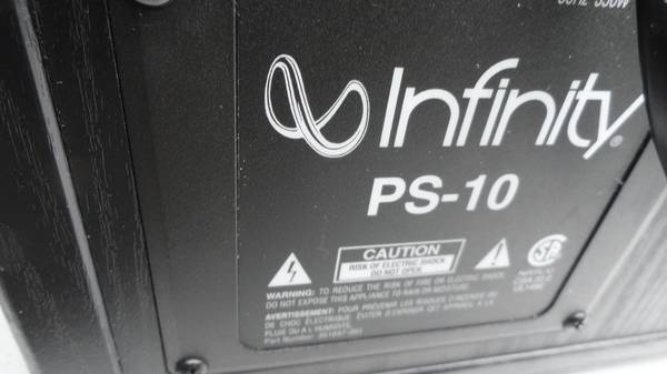 UP for sale is a clean and working Infinity PS-10 powered subwoofer. Infinity's midsize powered subwoofer. An oh-so-boring cube shape is par for the course for subs, and this model's only available finish is black "wood grain" vinyl. But we brightened up the PS 10's appearance by removing its grille to reveal the 10-inch front-firing woofer. The distinctive silver baffle lends the sub a fresh look. Considering the PS 10's prodigious 250 watts, the unit is fairly compact: 14.75 inches high, 12.5 inches wide, and 16 inches deep. It weighs a beefy 38 pounds.