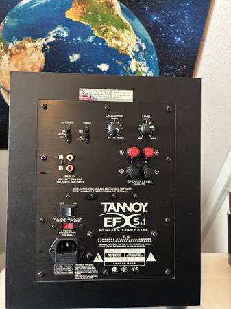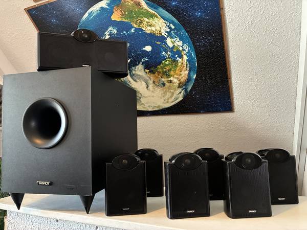 This is a Tannoy 7.1 home theatre speaker system. The subwoofer is an EFX 5.1 powered 8” subwoofer. There is one center dual speaker, with tweeter. And six satellite speaker/tweeters. All speakers...