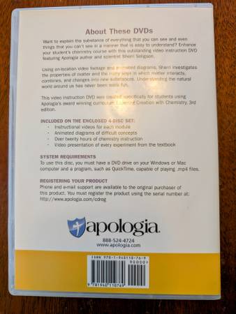This is a barely-used complete set of Exploring Creation With Chemistry 3rd Edition Video Instruction DVDs from Apologia curriculum, Sherri Seligson, instructor. There are four DVDs in the set, each one covering four of the sixteen modules. One student viewed some of the lessons on the first two discs, the last two discs were never even viewed. DVDs are Windows or Mac compatible. Chemistry is full of difficult concepts, it helps to have more instruction, videos, and animated diagrams.