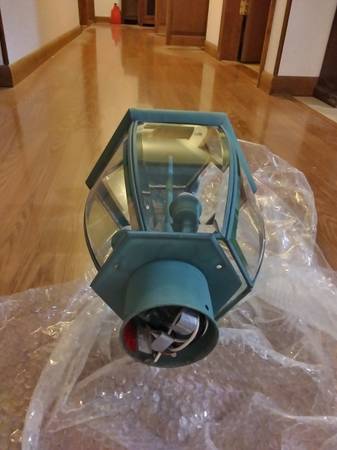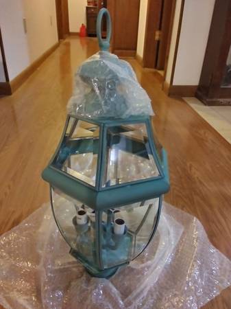 New solid brass outdoor post lantern, green, with beveled glass. Really nice! Asking $75, reasonable offers will be considered.