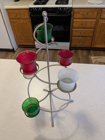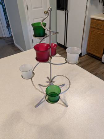New, still in original box, Festive Centerpiece by PartyLite. Centerpiece comes with six Votive Candleholders, two red, two green and two white. Centerpiece stands approximately 17 inches tall. See pictures for additional information.