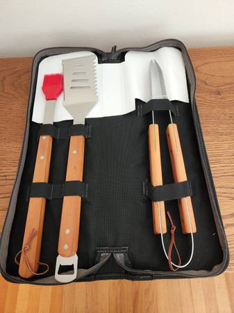 This is a very nice barbecue utensils kit in new condition. The kit comes in a durable plastic zipper Travel Channel case and includes a pair of stainless steel tongs, stainless steel serrated spatula with can opener end and rubber brush. All tools have a wooden handle and measure 16 inches in length.