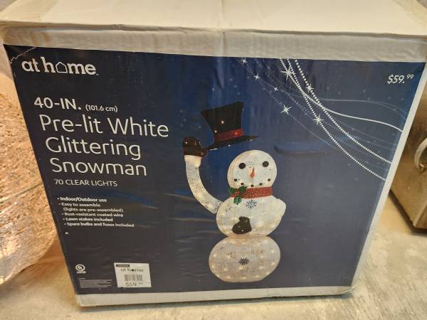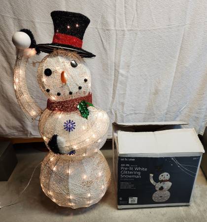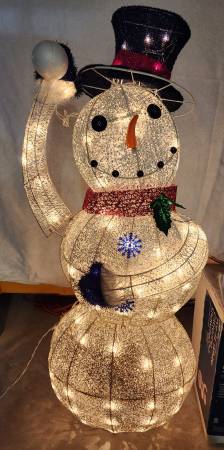 This lighted yard snowman decoration is used in good working condition with only minor wear. It is made of white metal wire, pre-lit strand lights and cloth decorations. It measures 40 inches high by 16 inches wide and 12 inches deep. Securing ground pegs are included.