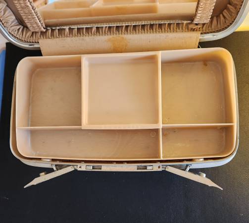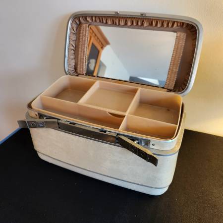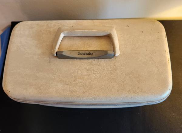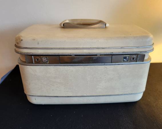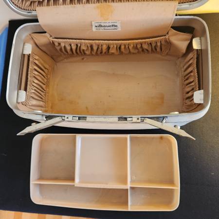 This vintage Samsonite Silhouette travel cosmetic case is in used condition. It is a Shwayder Bros. Inc. style 1512 hardside white with a removable interior plastic lidded tray. There are interior pouches and some staining. One corner of the interior lining is loose and a chipped piece on the tray. There is also a mirror. The handled case has two latch locks but no key. The cosmetic case measures 15 inches wide by 8 inches deep and 9 inches high.