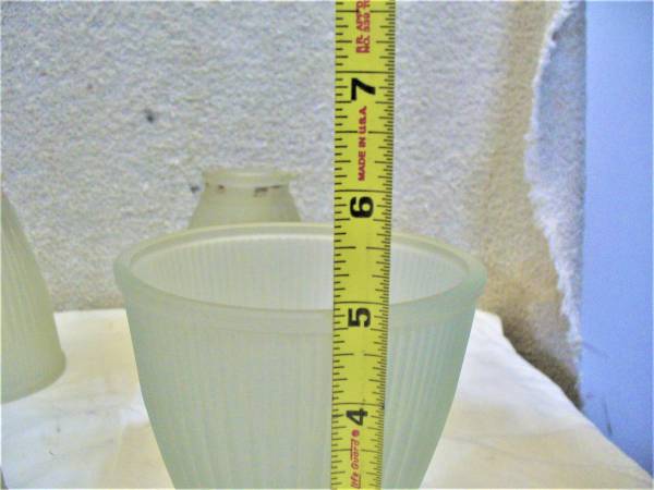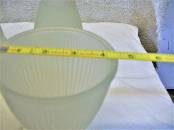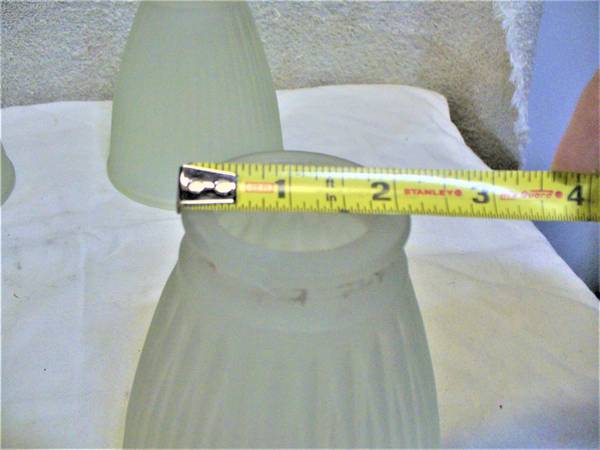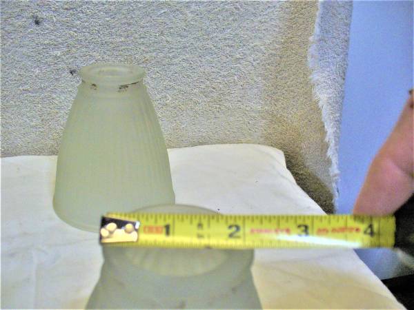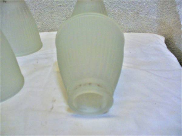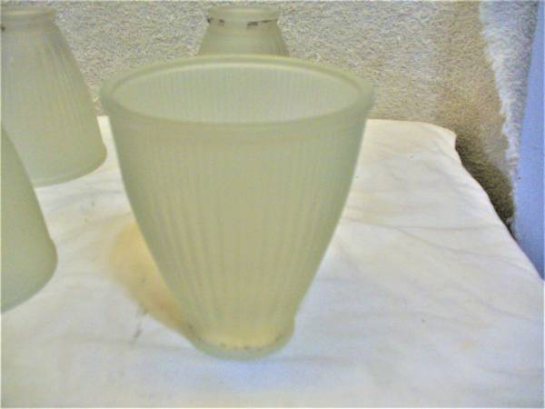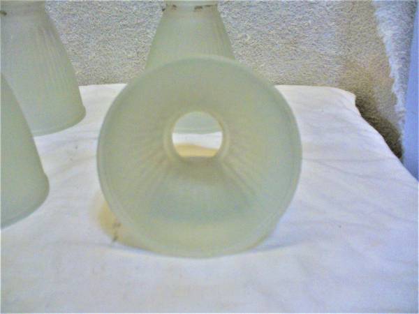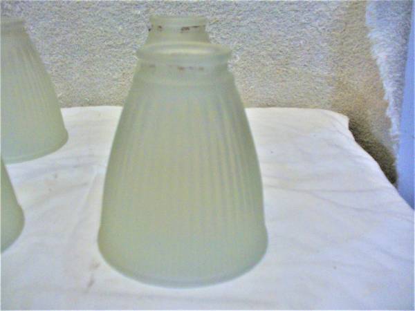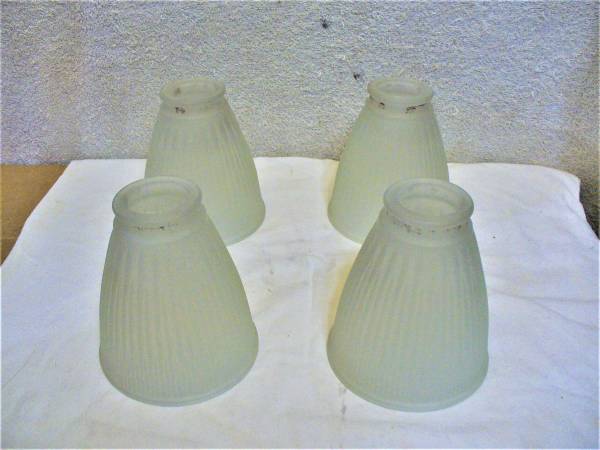 Four Frosted Glass Shades 5 inch deep X 4 3/8 inch opening, 2 1/8 inch mounting flange. $1 each.