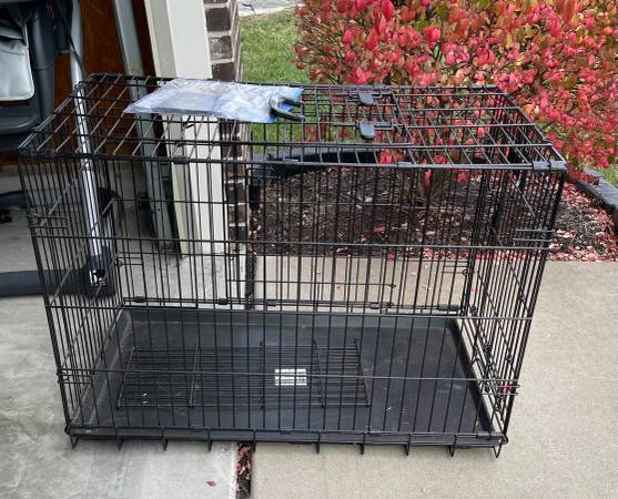 13.) GREAT CRATE; M/Lg dog, hammerstone finished, wire, 36 L x 23 w x 26 inches high crate; 3 locking access doors; dividing panel and sliding, sanitary pan. Easy to store and/or transport. GREAT canine den. training crate or travel crate. ($50.00)