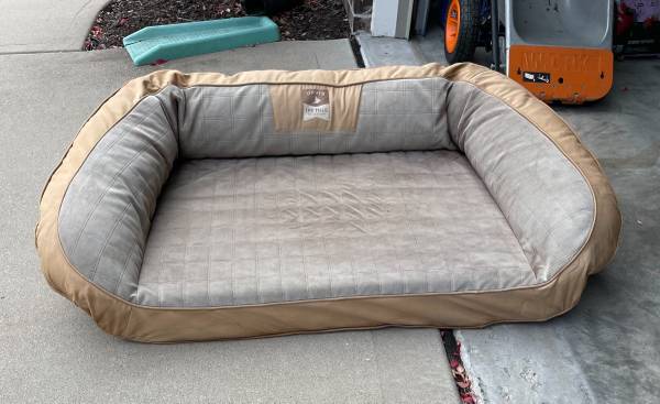 14.) ORVIS FIELD LG DOG MEMORY FOAM BED; Indoor/outdoor, zippered, washable, quilted, tan cover. Like new! ($65.00)