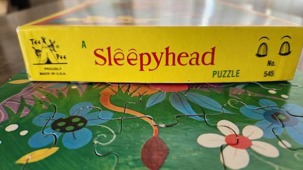 Adorable Vintage 1960s "A Sleepyhead Puzzle" by Tee Pee Toys, made in the U.S.A. The artwork and colors on this vintage puzzle and the box are just so sweet! Puzzle has 50 large pieces and measures 14" x 7" and all pieces are present. Asking $5. Pick up in St. Louis Hills, about one mile from the Ted Drewes Frozen Custard on Chippewa, 63109.