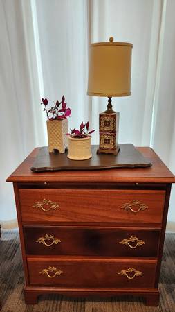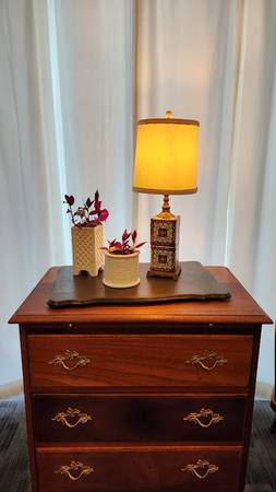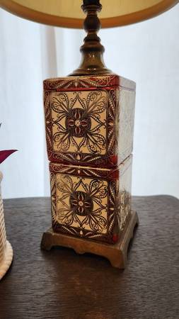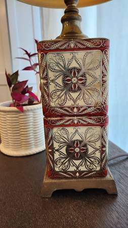 This Chinoiserie inspired decorative table lamp is in good, original condition and is ready to use. Lamp would fit in well with Boho Chic, Midcentury Modern and Eclectic Styles. This item measures 23 1/2“ tall (including lamp finial), body of lamp is 3 ¾” square and base is 4 ½” square. Silk shade with gold trim detail is included and measures 9” tall x 8” across. Please see pics for slight wear on shade (I always had worn side turned to the back so it was not visible). Lamp cord measures 92”. Asking $75 or best offer (See Etsy and Chairish for comparable lamps priced over $150). Pick up in St. Louis Hills, 63109 (about one mile from the Ted Drewes Frozen Custard that is on Chippewa).