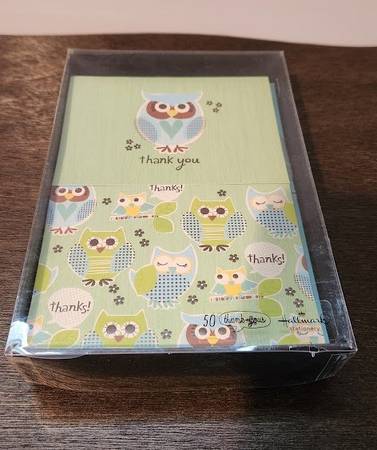 Two different quality thank you cards both with owls, 25 cards for each design along with blue envelopes (50 cards total). Cards measure 5" x 3 ¾”. Box is sealed, but bottom of box shows slight wear. Asking $10 (that’s .20 cents a card). Pick up in South St. Louis City, 63109 (about one mile from the Ted Drewes Frozen Custard that is on Chippewa).