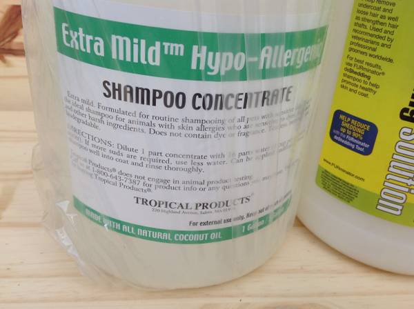 New, still sealed Tropicals Extra Mild Hypo-allergenic Shampoo Concentrate (dilution rate 1:16) 1 gallon jug and FURminator deShedding Solution Natural Base Conditioner (dilution rate 1:6) 1 gallon jug offered for cash sale. These may be used for both cats and dogs.