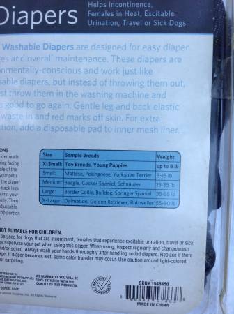I have never had a dog that needed diapers. I have had a kitten that needed diapers (found her injured, presumably hit by a car) and there isn’t much available in stores for that, so someone bought me a few packages of these to try. They didn’t really work out and I instead had to have some diapers custom-made. These are the packages that were never opened and are really just taking up space now.