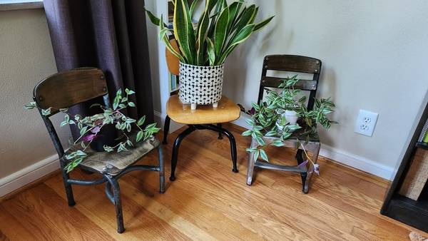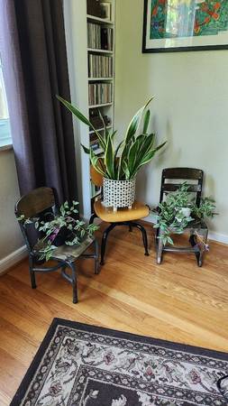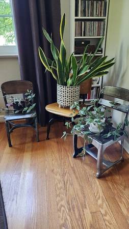 Elevate your house plants and green friends by giving them a seat of honor on one of these Vintage Children’s School Chairs. Each of these chairs has been lovingly restored to allow their historic beauty to shine through; note the hint of blue paint that was original to the one chair, or the highly polished steel on the other chair. The wood seats and backs have been sanded smooth and sealed with a polyurethane. These are authentically old, not reproductions. Add one of these cool chairs to your décor, they make great conversation pieces and would fit especially well with BOHO, Industrial, or Farmhouse styles. Perfect with a stack of books, as a plant stand, or a spot for your tot to take a 'time out' on a well-appointed seat! Asking $20 each or best offer. Pick up in South St. Louis City, 63109 (about one mile from the Ted Drewes Frozen Custard that is on Chippewa).