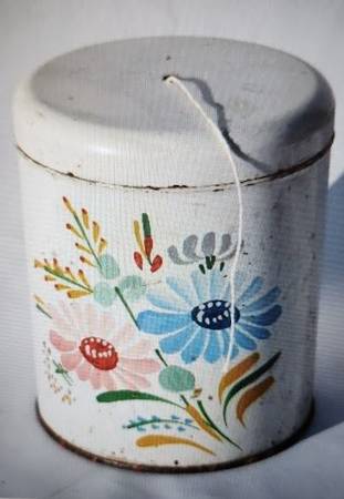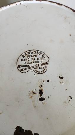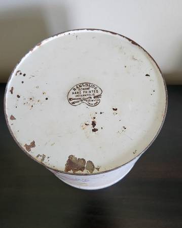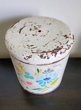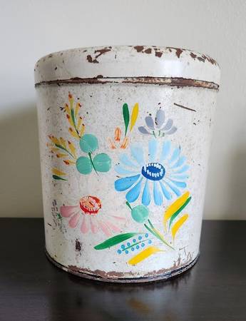 This vintage canister is marked “Ransburg Genuine Hand Painted, Indianapolis, Made in the U.S.A. This canister shows wear consistent with its age, but the lid comes off smoothly and is properly sealed and aligned with no dents present in the piece. Piece is missing the knob on its lid, unless it was intended to be a string holder as one is listed on ‘Laurel Leaf Farm’ online. This is a great old piece and would be a nice addition to a collection of vintage items, measures 7” in diameter and 7 ½” tall. Asking $8. Pick up in South St. Louis City, 63109 (about one mile from the Ted Drewes Frozen Custard that is on Chippewa).