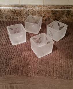 Four pretty little votive holders, frosted glass with fern leaf design. These measure just over 2" square. $3 for all. Perfect for a table setting, or for use in the bathroom to hold q-tips and...