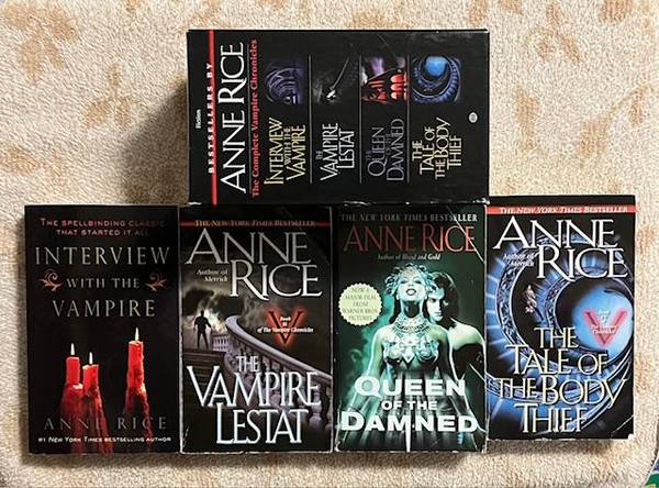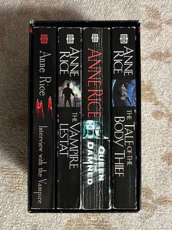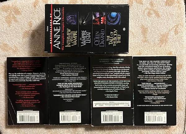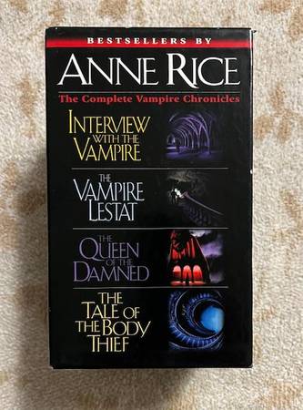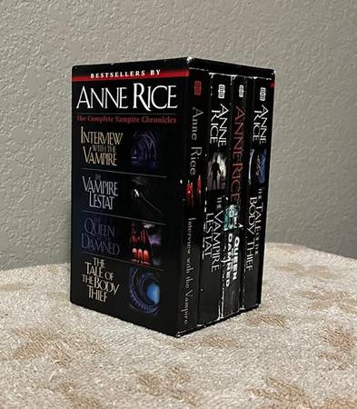 ~The Complete Vampire Chronicles by Anne Rice is a box set of four paperbacks containing the first four novels in the series. The books included are "Interview with the Vampire," "The Vampire Lestat," "The Queen of the Damned," and "The Tale of the Body Thief." This collection is a must-have for fans of the occult and supernatural, offering a captivating blend of horror and fiction and is a perfect addition to any bookshelf.~