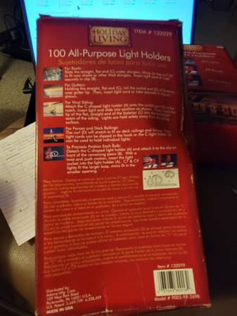 100 All Purpose Light Holders. Item #132029. I have 2 full boxes and 1 partial box - all for one money. Can be used on all lights, all roofs, and all gutters. White clips I am downsizing. Smoke free...