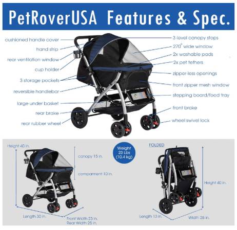 Works great for taking pets for walks or for sitting outside. Enough room for 2 small pets, or 1 larger one, up to 75 lbs.