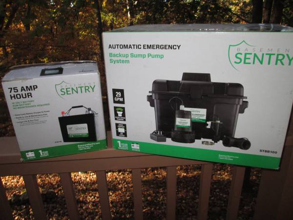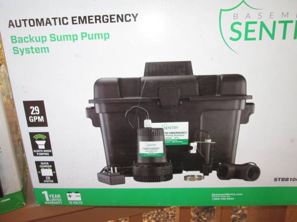 Have brand new, in box, Basement Sentry Battery Powered Back Up Sump Pump, model STBB100 AND 75 amp battery! Sump pump is 12 volt 29 gallon thermoplastic system to provide additional protection against basement flooding when your power goes out. It is designed to work during power outages or if the primary pump is not working. The system includes a 12 volt pump, controller, alarm system, battery charger, float switch and battery box. Works for sump pump basin at least 14 inches wide by 18 inches deep. NOTE: THIS INCLUDES A BRAND NEW BATTERY. Please call or text Bob at before 9 pm at show contact info