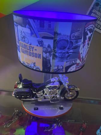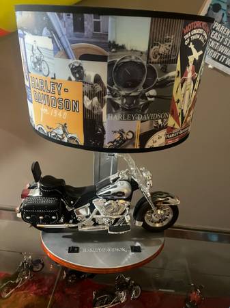 Harley Davidson Heritage Softail Table Lamp with Night Lights & Sound is in Excellent Condition The lamp allows you to turn on the sound of engine or have just the lights on. Headlight and taillight and the bottom of stand light up for the night lite. Lamp shade and lamp in excellent condition. Motorcycle is 14" Long and height of lamp including shade is approximately 18" Tall and overall 18" wide This will make a terrific addition to any collection or great gift for a motorcycle enthusiast. This lamp has been take very good care of and looks brand new.