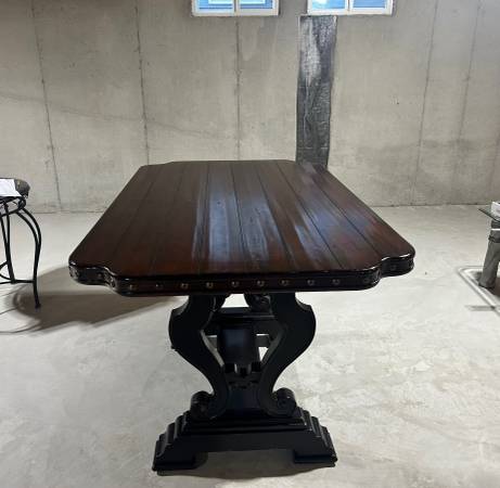 Bistro table, with plank top balanced by more formal scrolling in the base. Dimensions: 64W x 38D x 36H in . Table legs remove from top for transporting https://www.lexington.com/sienna-bistro-table...