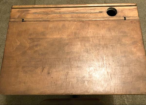 This vintage school desk is a true Americana piece, with a medium wood tone oak top with ink well hole, and steel frame.