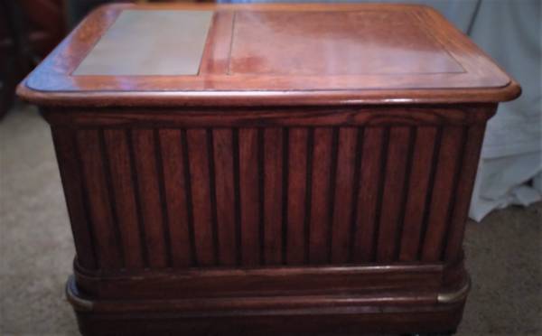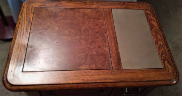 TOP IS UNIQUE BURLED WOOD COMBINED WITH METAL COPPER TOP INSERT.