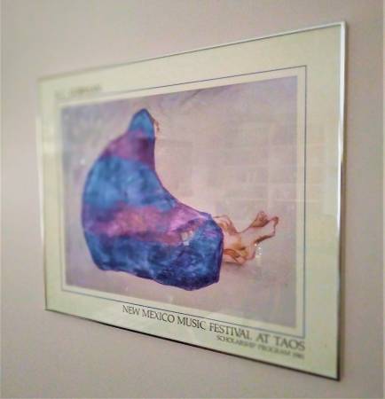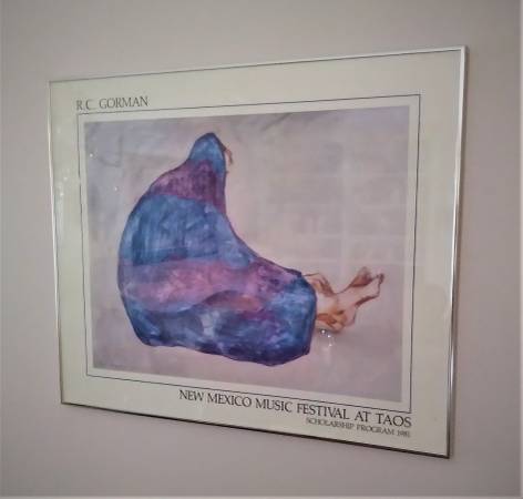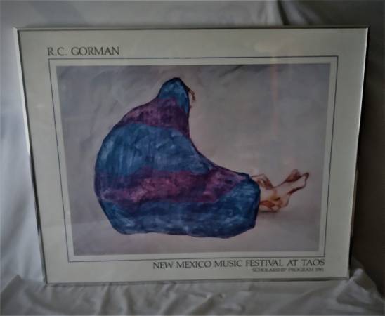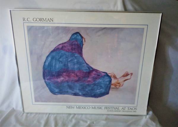 This picture was by Native American artist RC Gorman (1931-2005) who loved to paint women in vibrant colors and fluid forms. Emphasis is often on graceful hands and feet. This was done for for the New Mexico Music Festival at Taos in 1981. The art is from a painting called "Francine".It is in perfect condition, framed over glass.Still looks great throughout. This is NOT a modern reproduction. It is on heavy paper and the colors a vibrant blue and purple.Signed R. C. Gorman c 1981...signed in the art before litho was made, and included the copyright symbol.