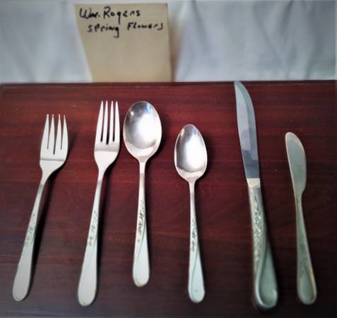 "Spring Flowers" Rogers flatware pattern by Wm. Rogers & Son (around 1956). Silver-plated, feature floral design, and were produced in the mid-20th century during a period of mid-century modern design.